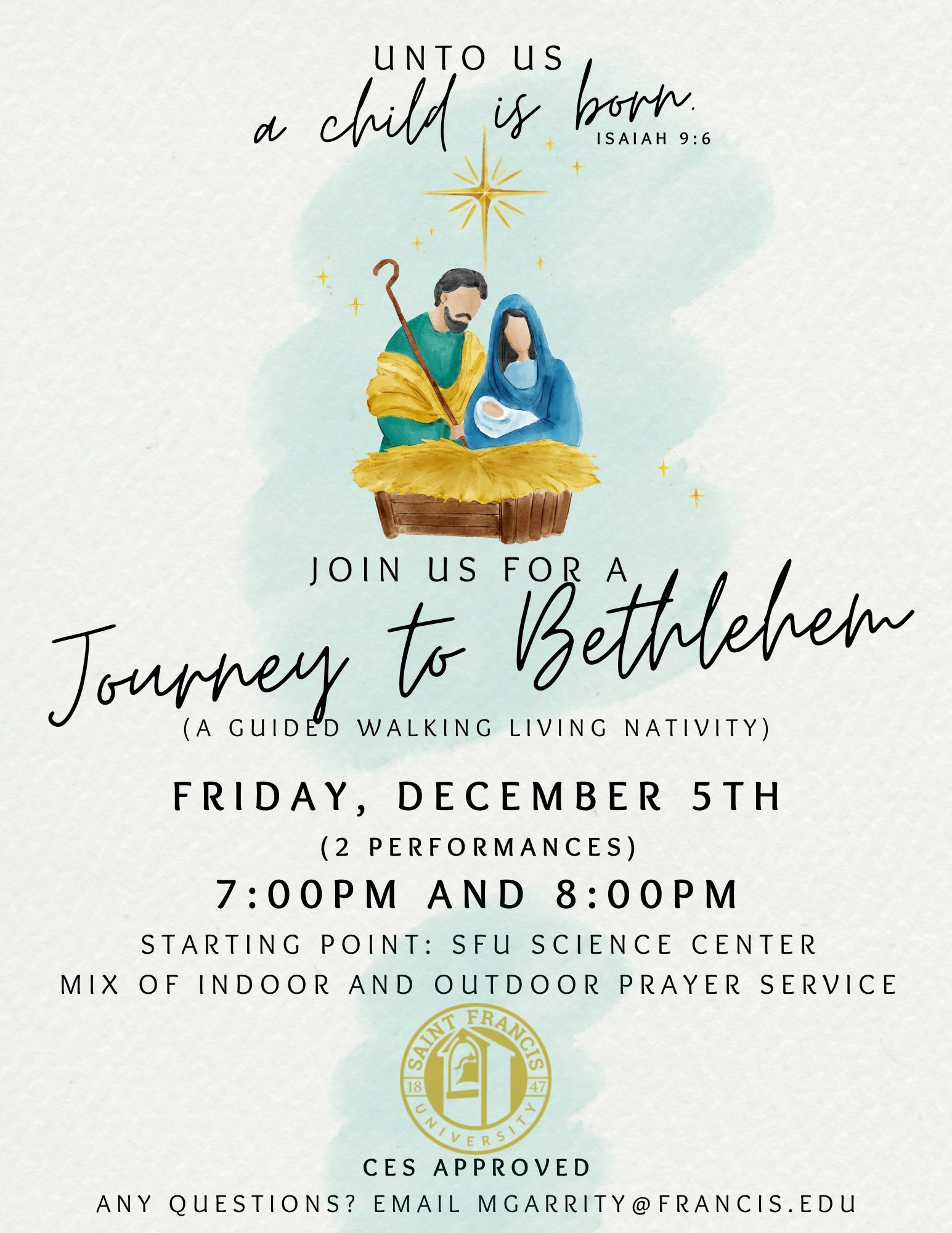 Loretto, PA (11/19/2025) — Saint Francis University welcomes the public to attend a Journey to Bethlehem (a guided walking Live Nativity) on Friday, December 5 with two performance times 7 p.m. and 8 p.m. This heartfelt reenactment of Mary and Joseph's journey, brought to life by members of the SFU community, begins in the lobby of SFU's Science Center, located next to the Immaculate Conception Chapel. Two performance times: 7:00 PM and 8:00 PM
